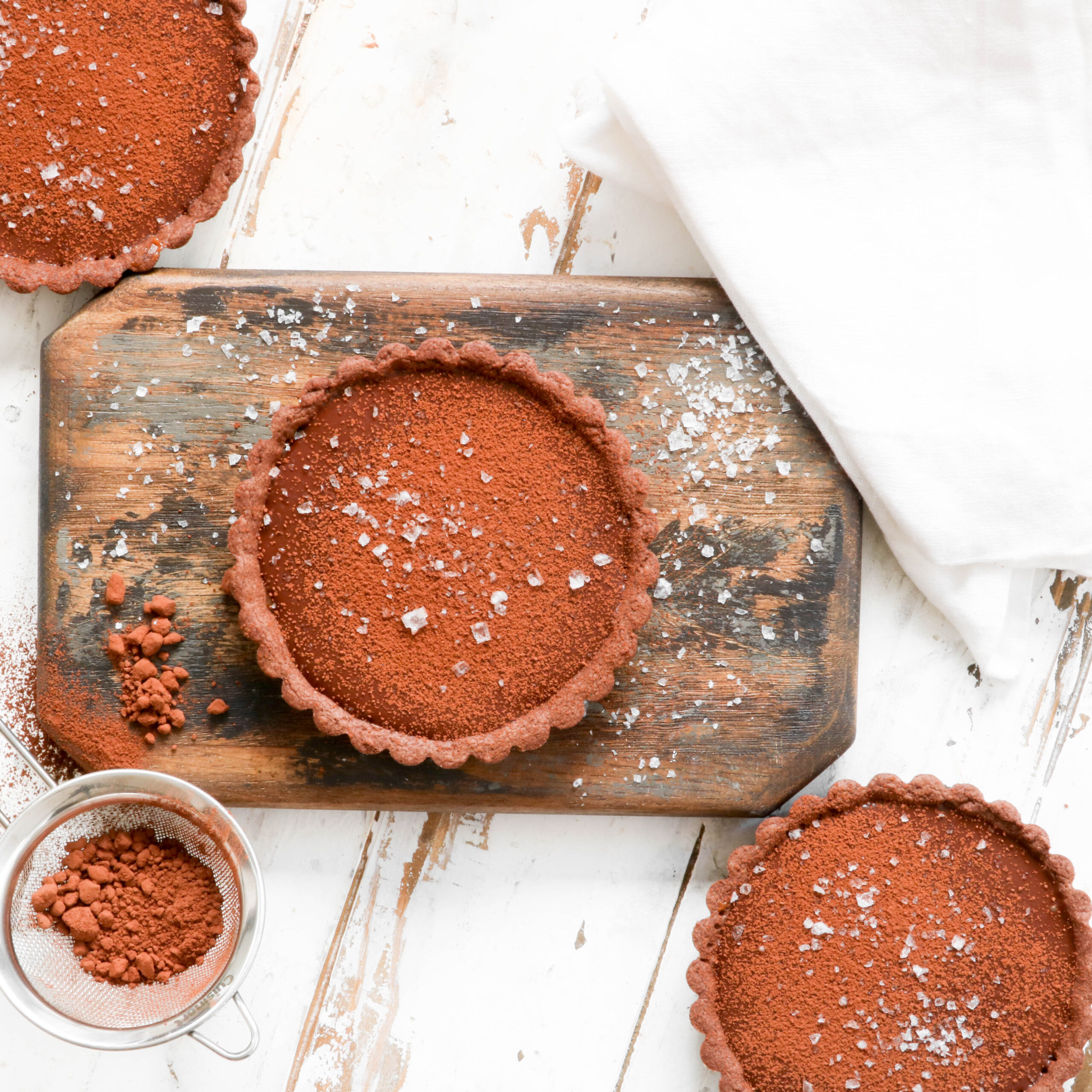 - Make the chocolate shortcrust shell: Mix ingredients, roll the dough thin, and chill. Cut approximately 6″ circles out of chilled dough, line tart pans, and trim excess. Chill again, and while those are chilling, preheat oven to 350ยฐF. Bake tart shells until darked around the outside and matte in color throughout, approximately 15 minutes. Set aside to cool.