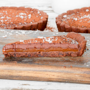 As seen on Next Level Baker! Well, sort of. I attempted to make this during the first challenge (which was Chocolate) while in the basement kitchen, and let’s just say things… didn’t go as planned. But, let’s not dwell on the past… this recipe for individual-sized salted caramel chocolate tarts is an absolute home run. A rich salted caramel meets a silky chocolate ganache in a crisp chocolate shortcrust for a simple yet stunning dessert that hits the perfect balance of salty-sweet.