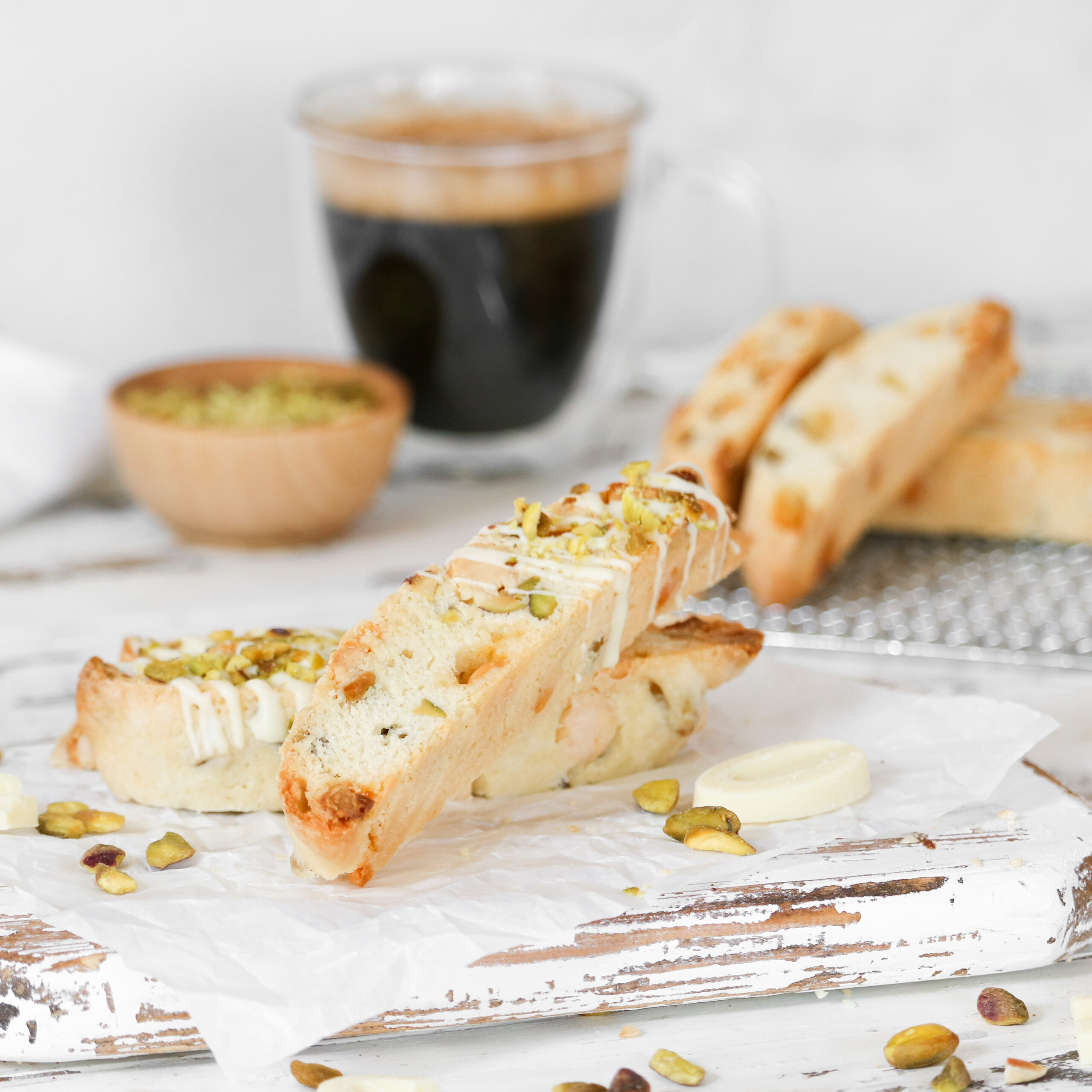 5. Drizzle melted white chocolate over 1/3 of each biscotti and sprinkle with reserve chopped pistachios to garnish.